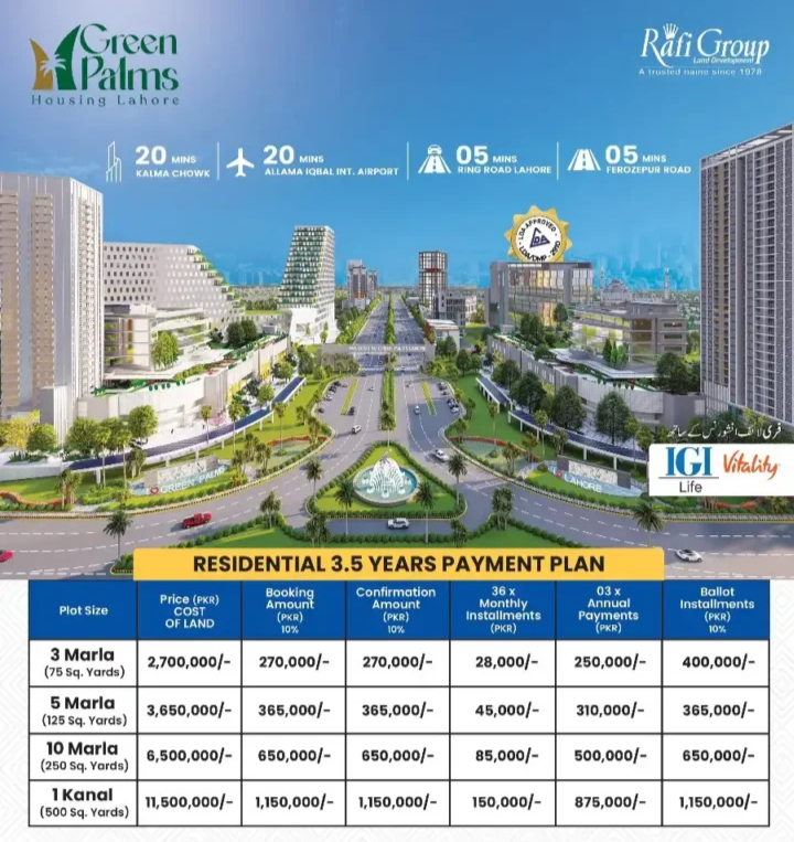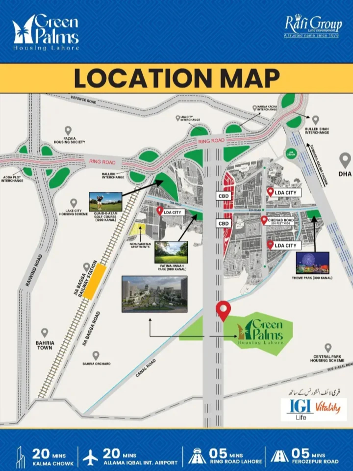 Welcome to Green Palms Housing Lahore, an LDA Approved residential and commercial project by Rafi Group, a trusted name in real estate since 1978. Ideally located on the 300 Feet Wide Jehlum Road (LDA Structure Road), the project offers affordable plots with flexible instalment plans and exceptional future growth potential. With direct connectivity to Ring Road, Chenab Road, Ferozepur Road, and the upcoming CBD 2, Green Palms is set to become one of Lahore’s most promising housing communities.