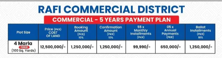 For investors and business owners, Rafi Commercial District offers premium 4 Marla commercial plots at just PKR 12,500,000 on a 5-year easy instalment plan.
